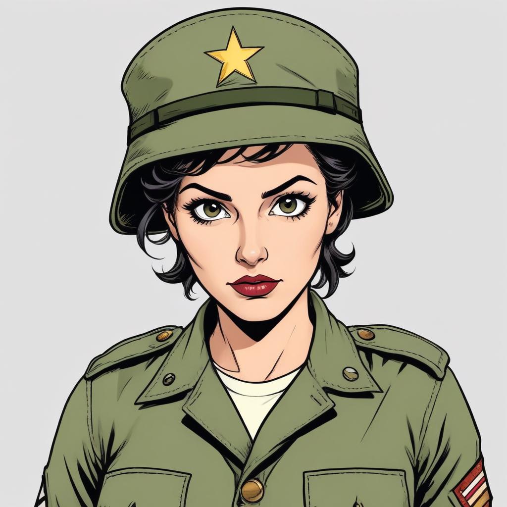 A confident woman dressed in a military uniform stands firm. Her expression shows determination and strength, highlighting her role.