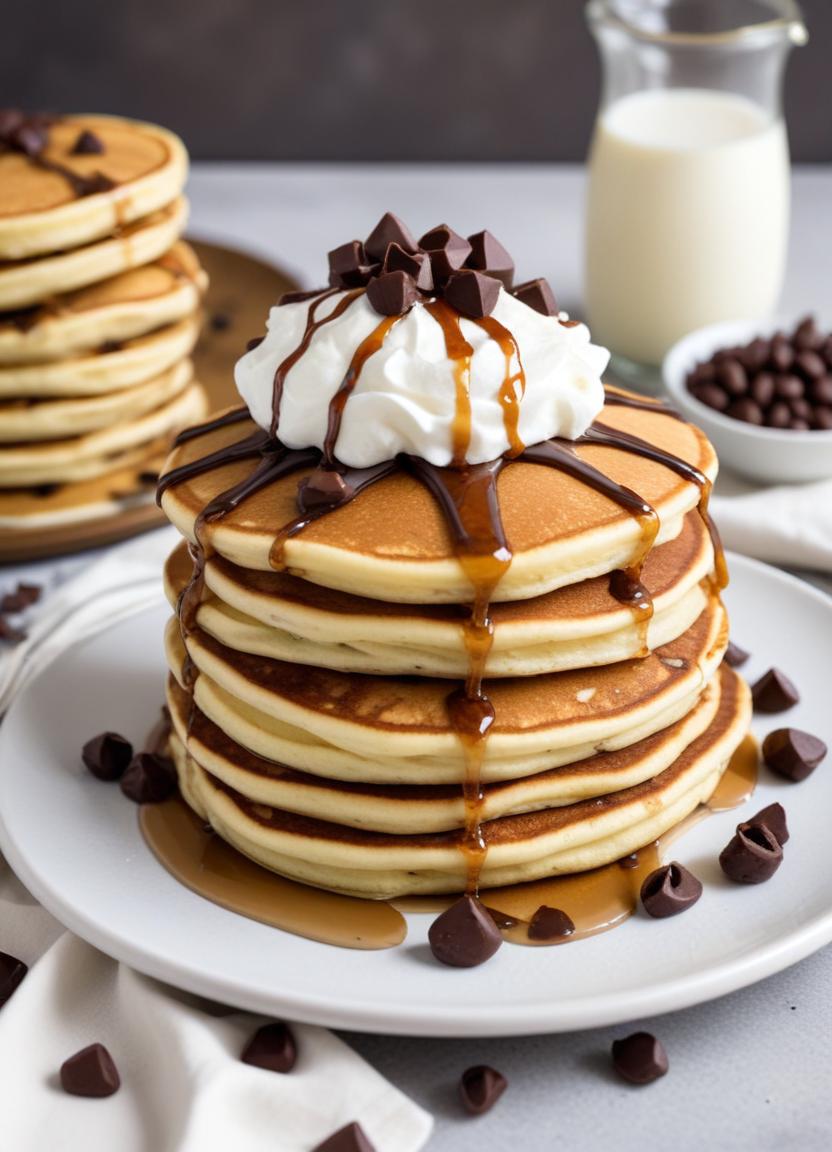 breakfast, chocolate chips, delicious, dessert, fluffy, food, homemade, kitchen, milk, morning, pancakes, plate, recipe, soft, stack, sweet, syrup, toppings, treat, whipped cream