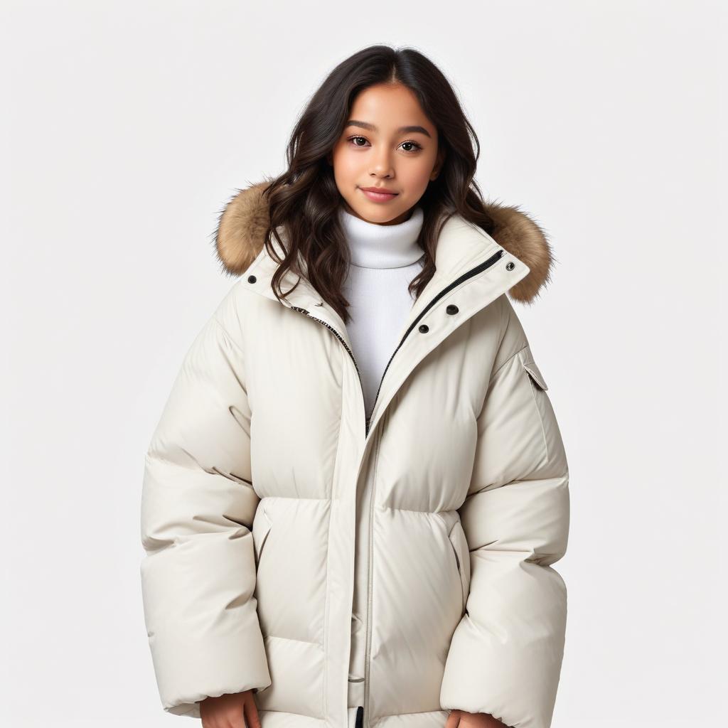 A young person models a warm puffer coat with a fur-lined hood and a cozy turtleneck, perfect for cold weather fashion.