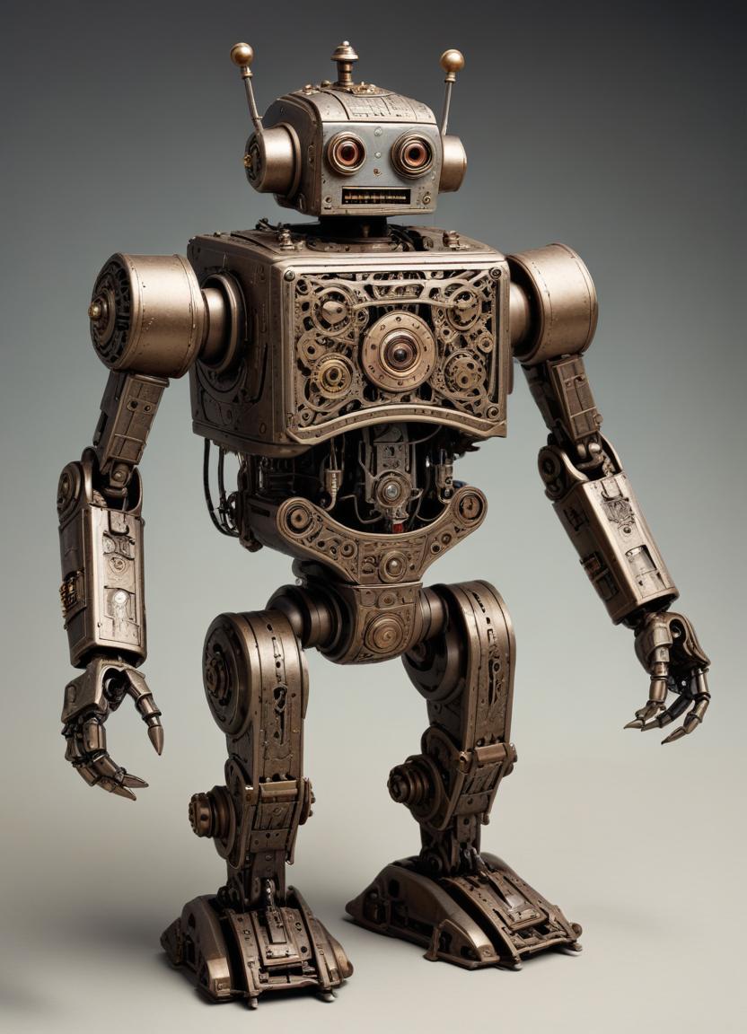 A steampunk-inspired robot stands with intricate gears and metal parts, showcasing its retro-futuristic design and craftsmanship.