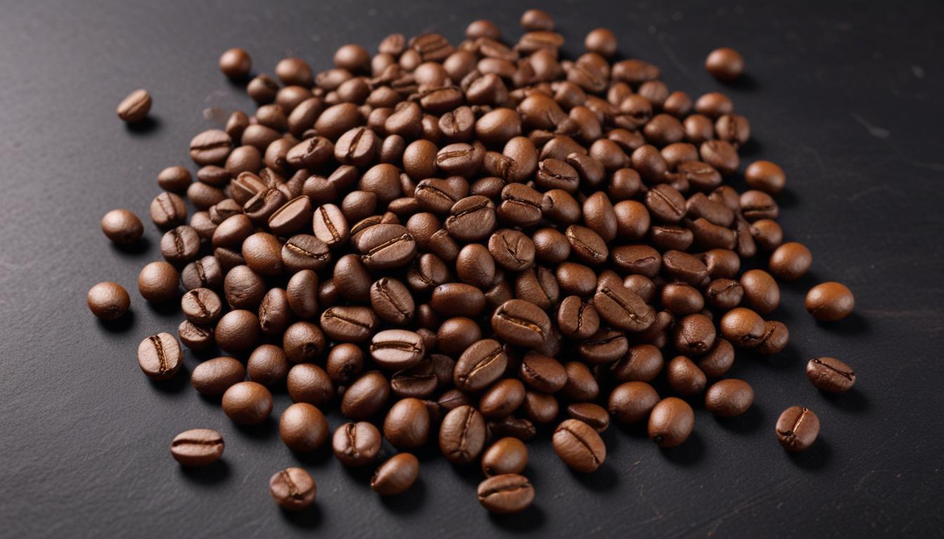 Freshly roasted coffee beans spread across a dark surface