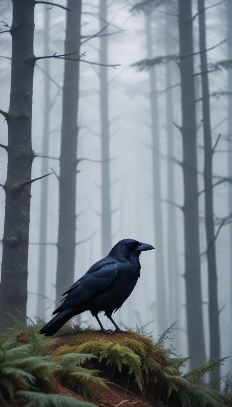A raven stands on moss in a misty forest, surrounded by tall, gray trees. The atmosphere is quiet and mysterious, evoking a sense of calm.