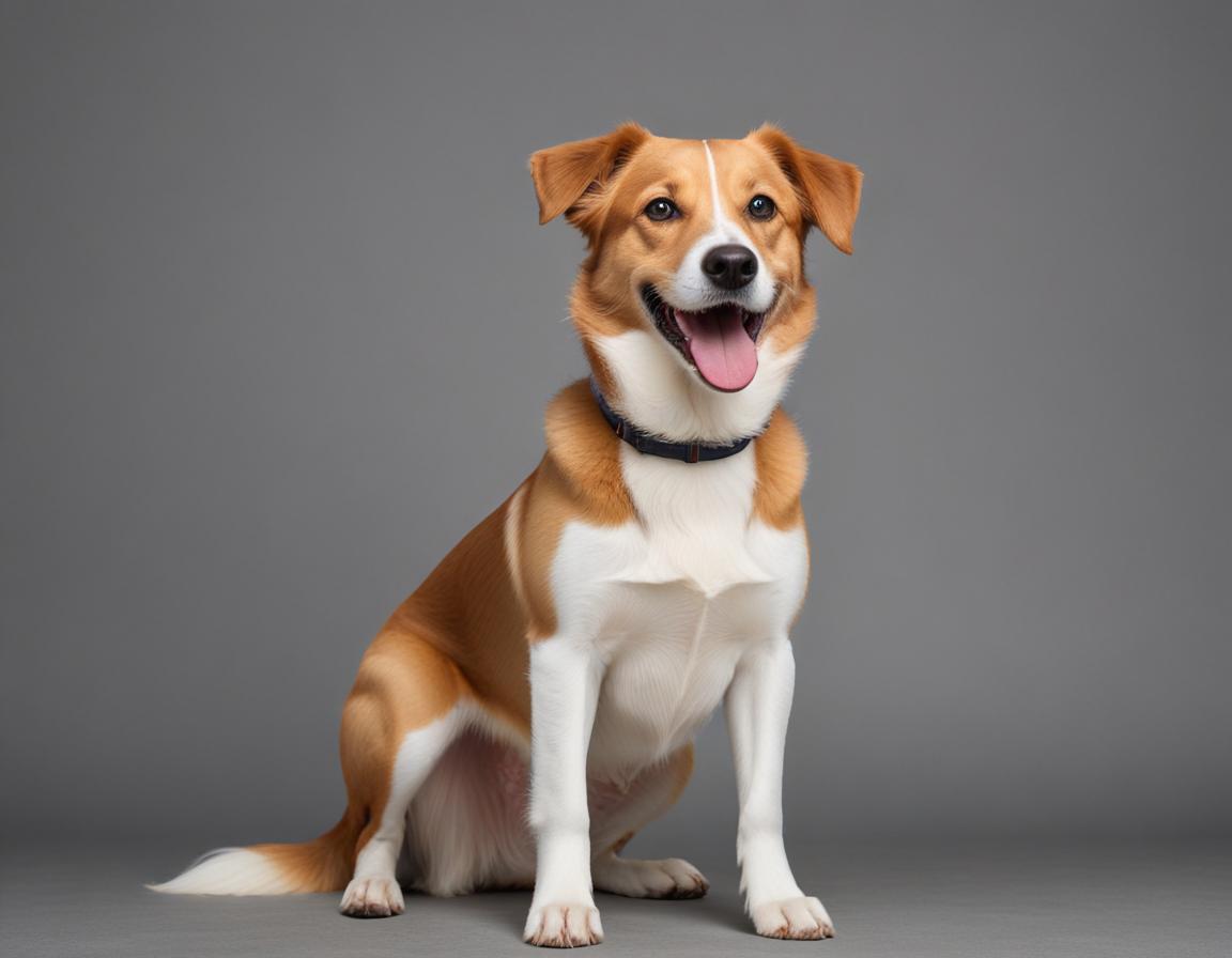 A cheerful dog sits proudly against a neutral backdrop, showcasing its playful nature and friendly demeanor with a big smile.