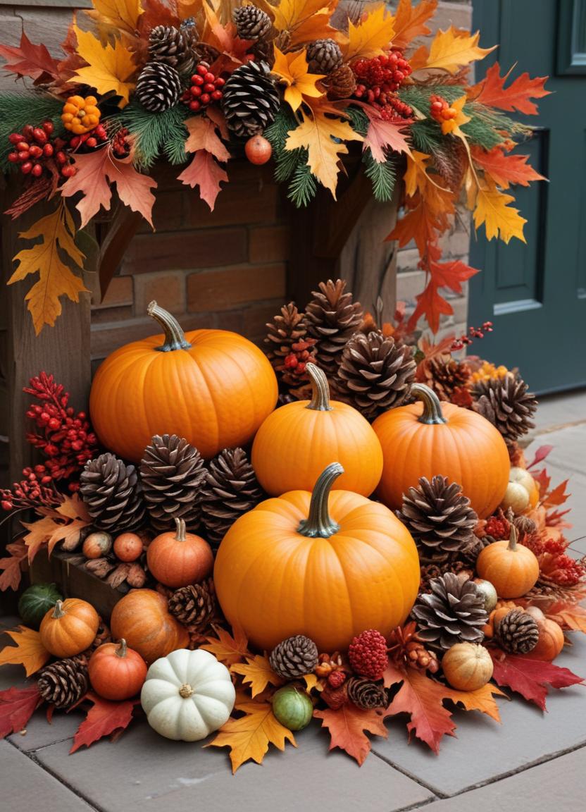 arrangement, autumn, autumn colors, berries, celebration, decoration, doorstep, fall decor, festive, gourds, harvest, home entrance, leaves, nature, orange, outdoor decor, pinecones, pumpkins, seasonal display, warm tones