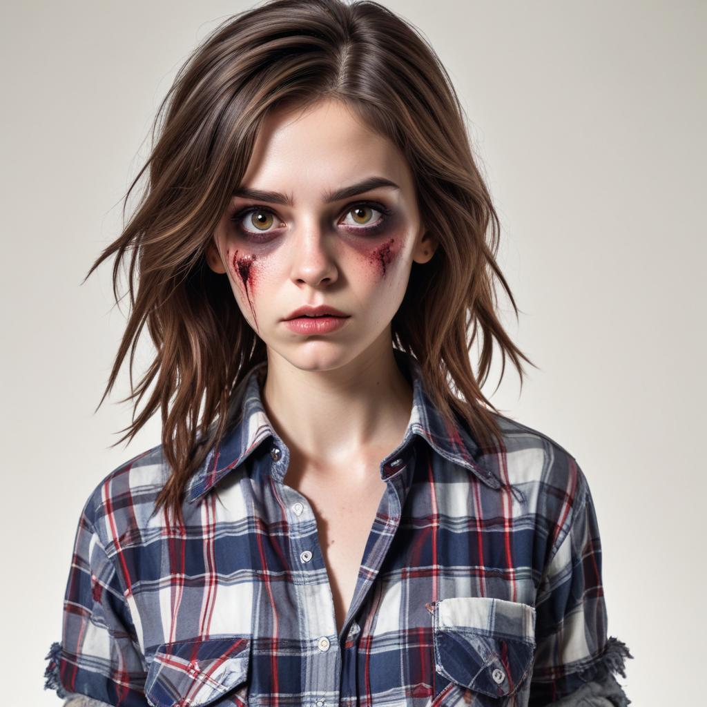 A confident young woman poses with striking makeup and a plaid shirt. The bold look features dark colors and artistic details, showcasing creativity.