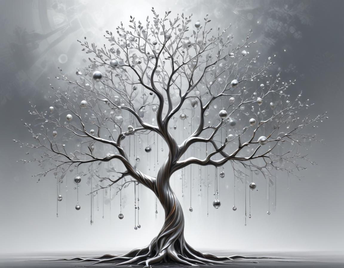 A detailed tree with twisting branches and sparkling ornaments hangs quietly in a serene black and white setting, creating a tranquil atmosphere.