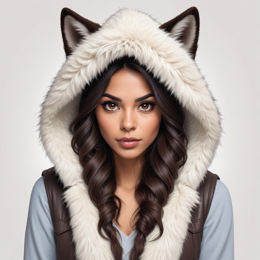 A model poses with a furry hood featuring animal ears. The soft fabric contrasts with her smooth hair and captivating expression.