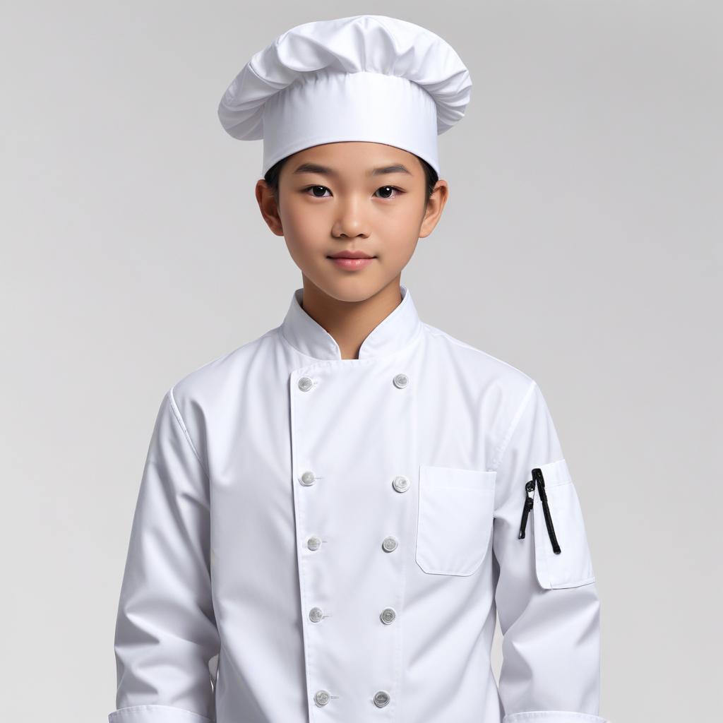 A young chef stands confidently in a white uniform and hat, prepared for cooking. The background is neutral, focusing on their determination.