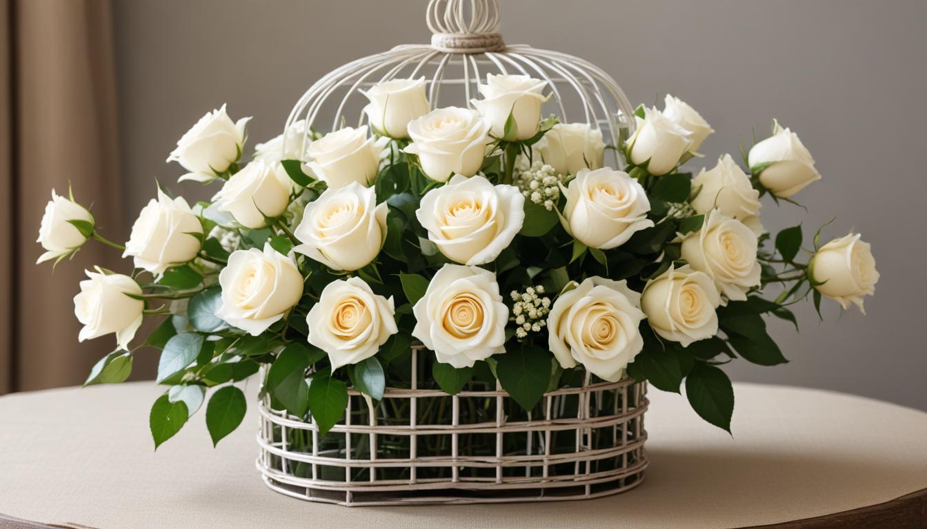 casual atmosphere, celebration flowers, charming display, decorative cage, elegant flowers, floral decoration, floral design, flower arrangement, fresh blooms, gift ideas, home decoration, indoor decor, indoor gardening, lush greenery, natural beauty, romantic decor, soft colors, table centerpiece, wedding flowers, white roses