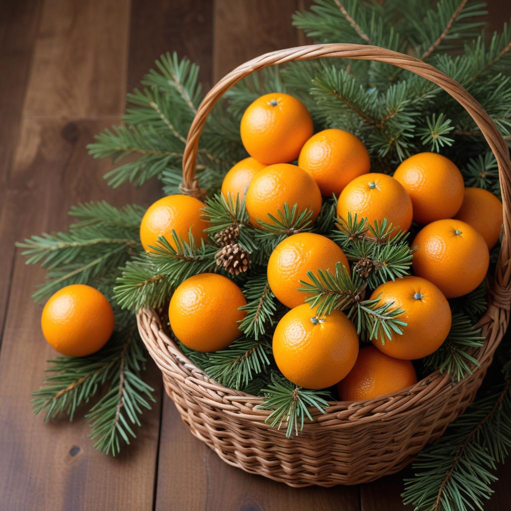 Fresh oranges are arranged in a woven basket, placed on a wooden surface with pine branches adding a festive touch, showcasing seasonal abundance.