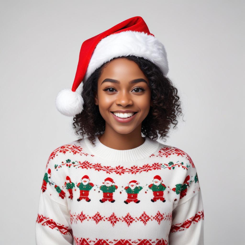 A girl wears a festive sweater and a red Santa hat, smiling warmly at the camera. The cheerful expression captures the holiday spirit.