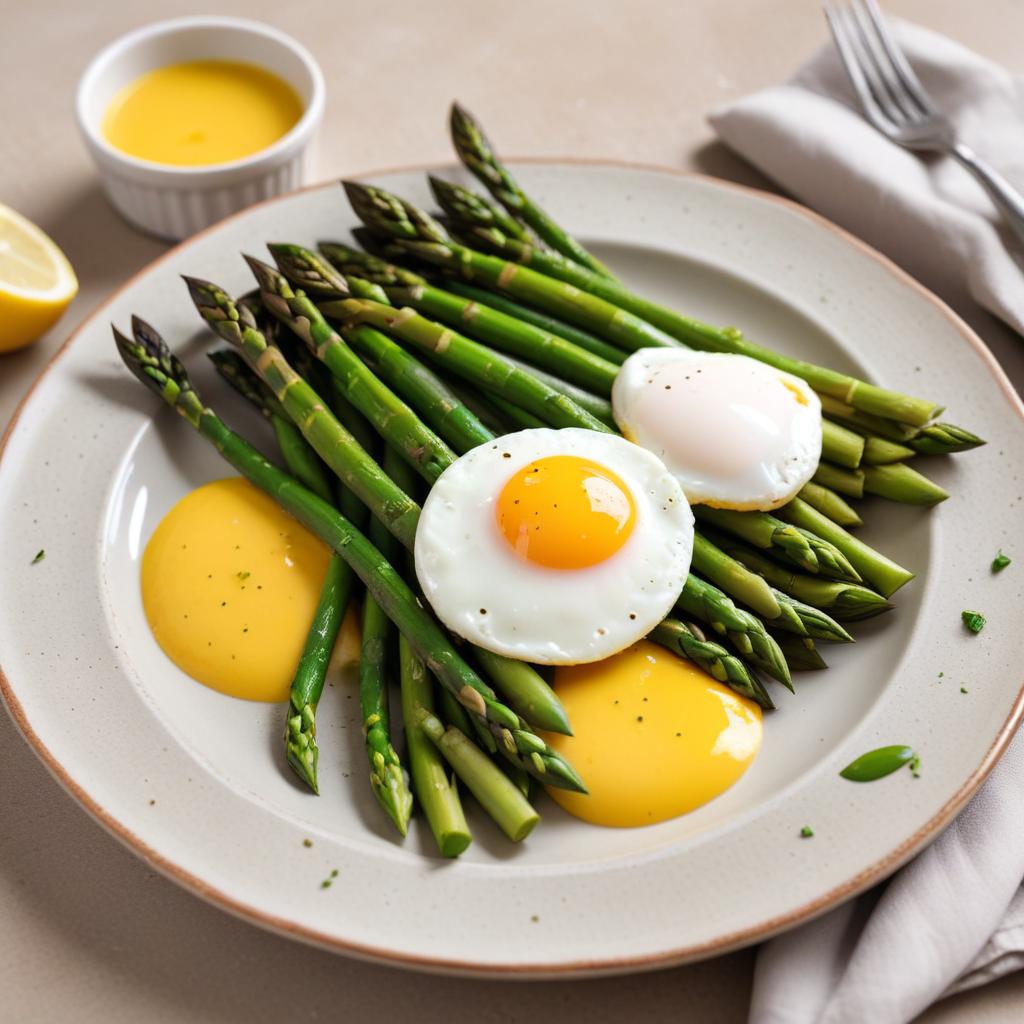 asparagus, breakfast idea, brunch recipe, cooking technique, culinary presentation, egg yolk, elegant presentation, farm fresh, flavorful dish, fresh ingredients, gourmet cooking, green vegetables, healthy meal, homemade recipe, lemon sauce, nutritious meal, plated food, poached eggs, simple cooking, vegetarian dish