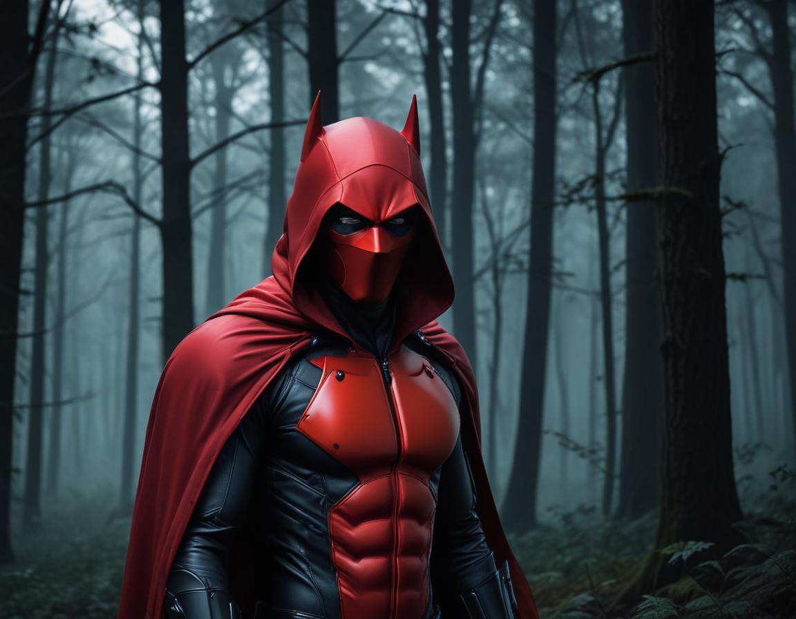 action figure, adventure, adventure setting, dark forest, dramatic cape, dramatic lighting, enchanting scenery, fantasy character, forest atmosphere, heroic theme, hooded figure, misty woods, mysterious presence, nature, night scene, red costume, solitude, superhero, tension, tree silhouettes