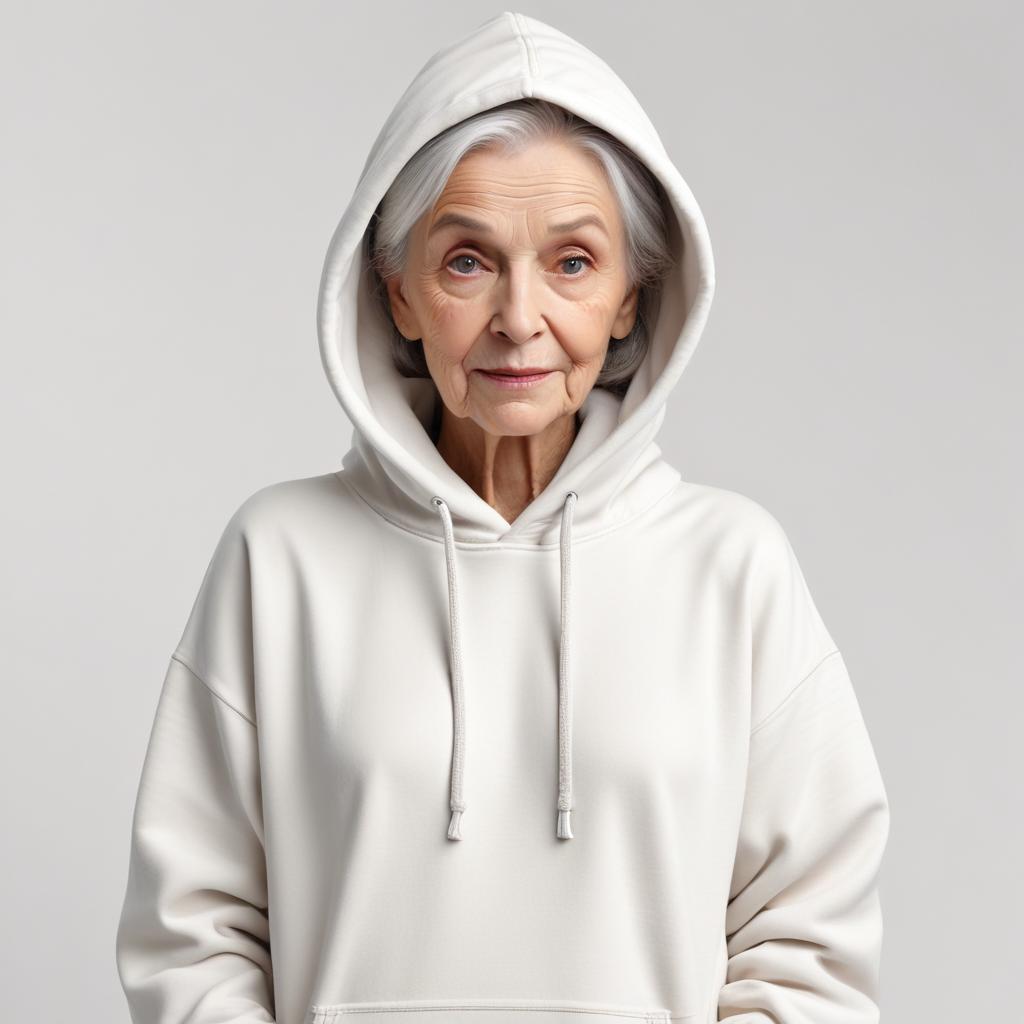 An elderly woman stands against a plain background wearing a light hoodie. Her expression is calm and thoughtful, capturing a moment of serenity.