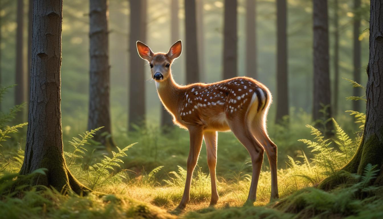 A young deer stands gracefully among tall trees, surrounded by lush ferns and softened light filtering through the forest.