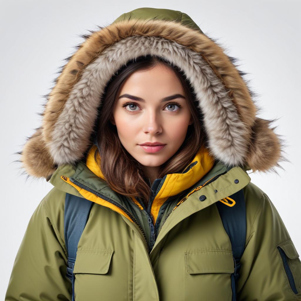 Young woman wearing a warm winter jacket with a fur-lined hood, ready for cold weather and outdoor activities, showcasing warmth and style.