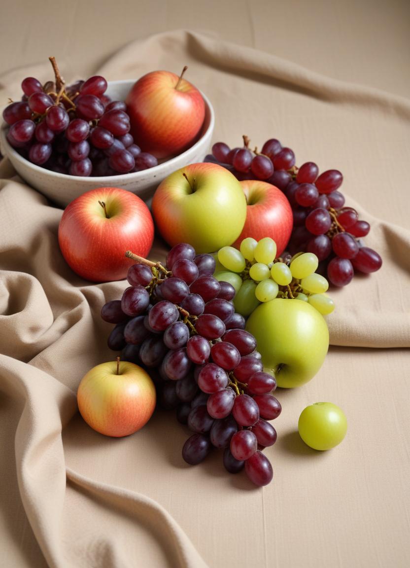 A bowl of red apples sits beside clusters of red and green grapes on a soft beige fabric. The scene showcases a vibrant display of fresh fruit.