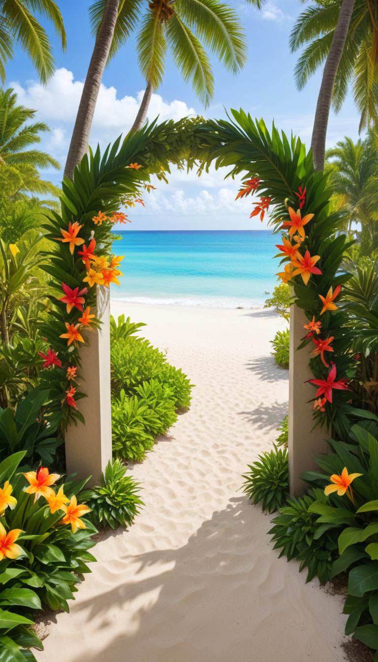 A vibrant pathway lined with colorful flowers leads to a stunning beach with clear blue waters and soft white sand under a sunny sky.