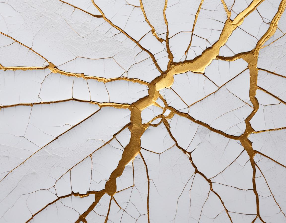 A textured wall features intricate cracks highlighted by golden lines, creating a striking contrast against the white backdrop.
