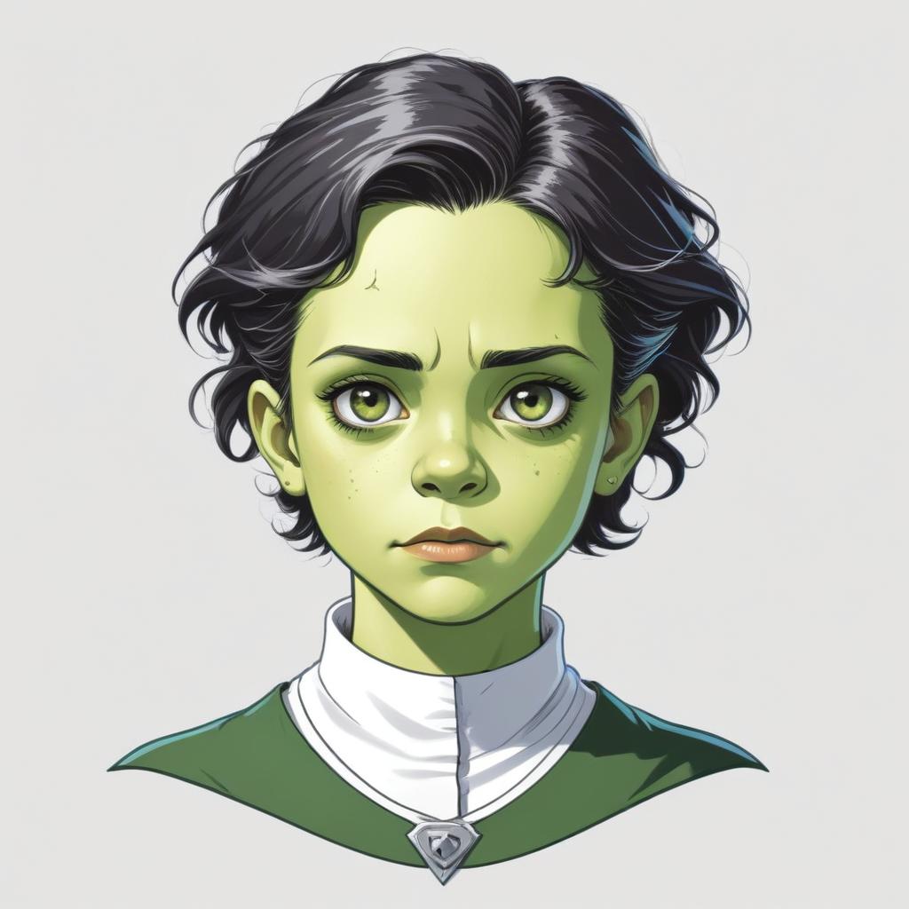 A young character with green skin and dark hair stares intensely at the viewer, showcasing detailed facial features and expression.