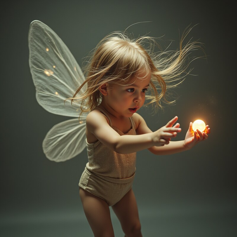 A young child with fairy wings plays with a glowing orb, showcasing wonder and imagination in a dimly lit setting.