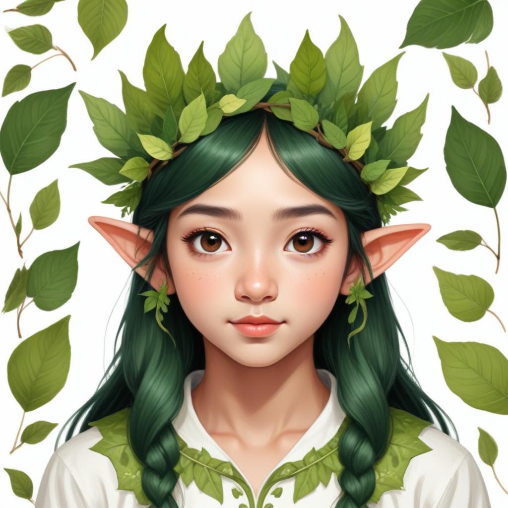 botanical, cartoon, character design, ecology, elven features, enchantment, fantasy, foliage, forest spirit, green hair, greenery, leaf crown, lush, magic, mystical, nature, peaceful expression, portrait, whimsy, young girl