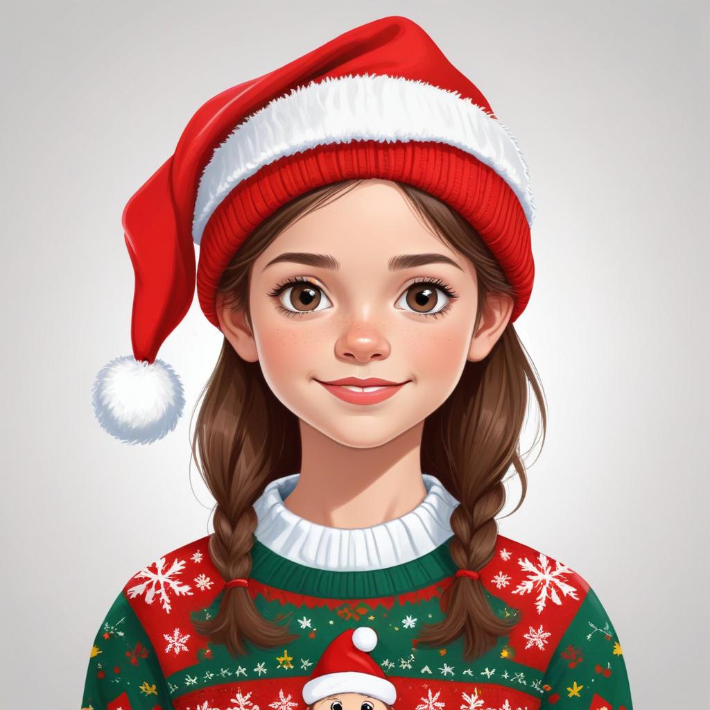 A young girl with braided hair wears a festive Christmas sweater and a red hat. She smiles brightly against a light background.