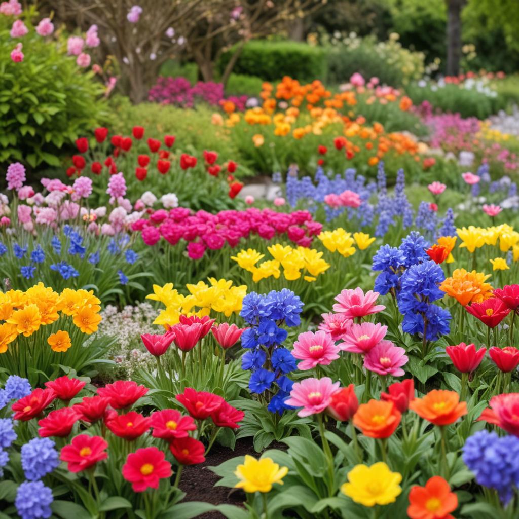 A vibrant garden showcases blooming flowers in various colors. Tulips, daisies, and hyacinths create a lively scene in springtime.