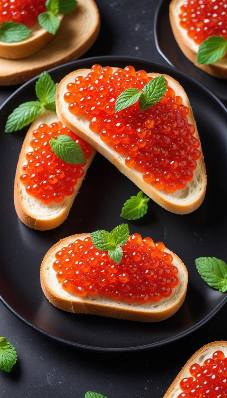 Delicious slices of bread are garnished with vibrant red caviar and fresh mint leaves, served on a dark plate, creating an appetizing display.