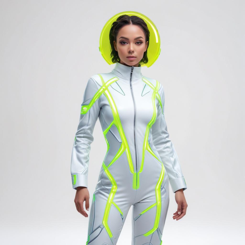Model showcases a sleek, futuristic space suit with vibrant neon accents. The design emphasizes modernity and innovation in fashion.