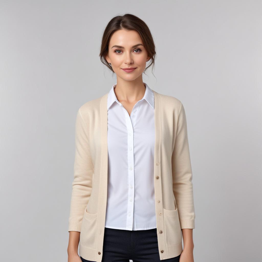 A woman stands confidently, wearing a cream cardigan over a white shirt. Her expression is calm and professional, perfect for a workplace setting.