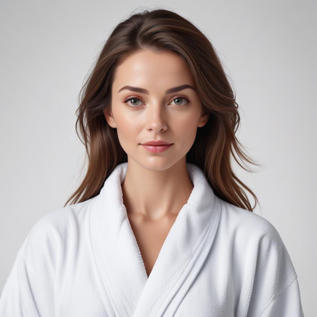 A young woman stands confidently in a white bathrobe, exuding calmness and beauty.