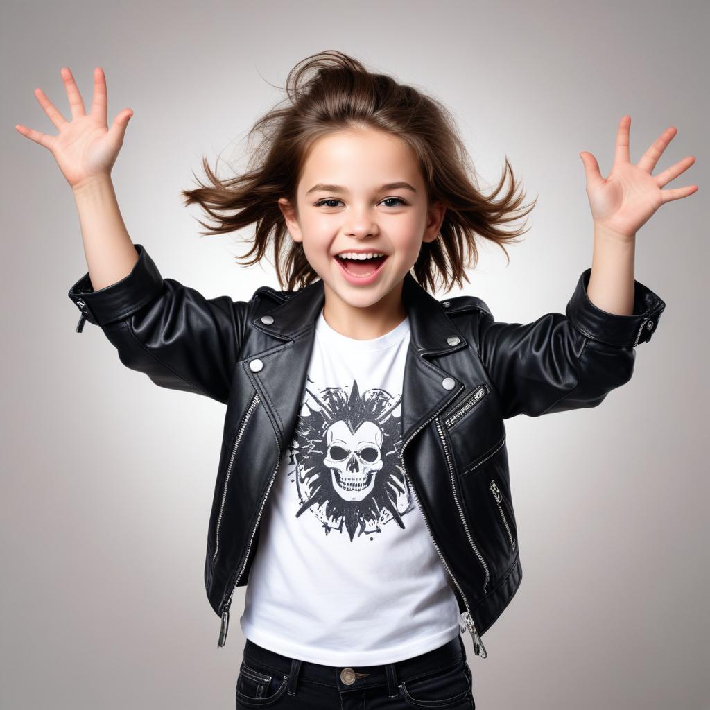 cheerful, child, clothing, excitement, expression, fashion, girl, graphic shirt, hairstyle, hands up, happiness, joy, kids, leather jacket, movement, neutral background, playful, smiling, style, youth