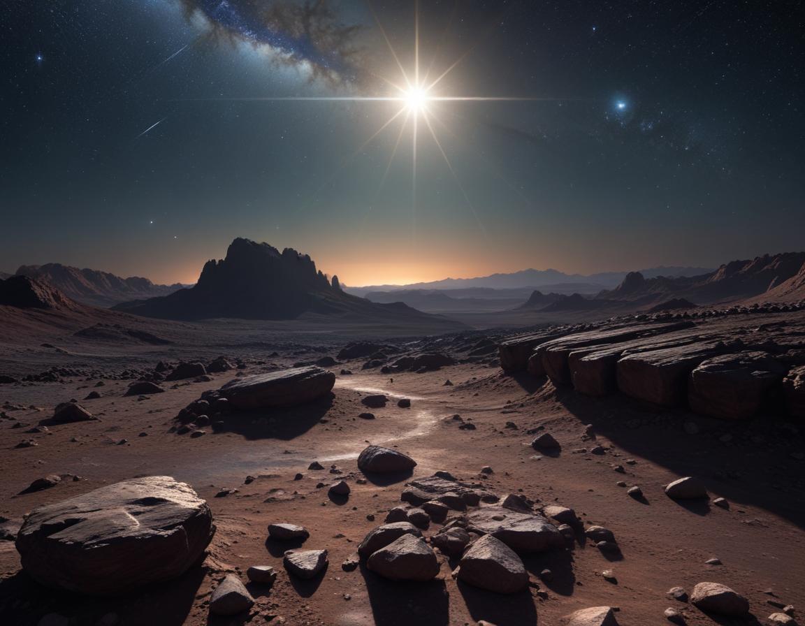 adventure, alien landscape, astronomy, celestial, cosmos, desert, exploration, extraterrestrial, mountains, nature, night, planetary, rocks, rocky terrain, scenery, starry sky, sunset, surreal, tranquil, twilight