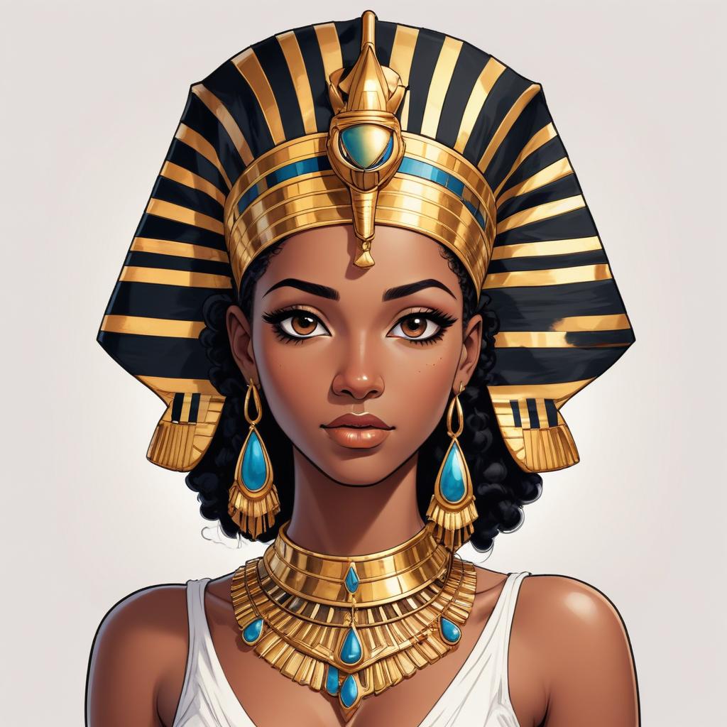 A regal figure adorned in a golden headdress and elegant jewelry. The background is neutral, highlighting her striking features and attire.