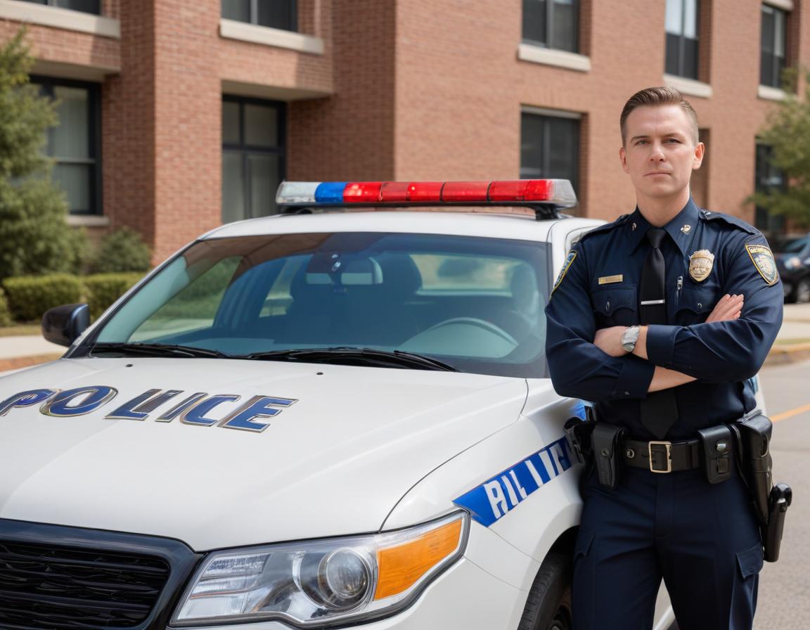 A police officer stands confidently next to a marked patrol car, showcasing their authority and commitment to safety in an urban setting.