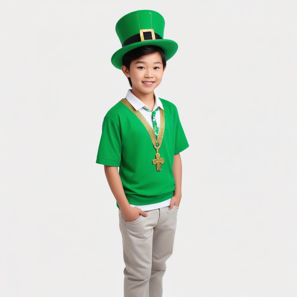 A young boy wears a green outfit and a large hat, celebrating St. Patrick's Day with joy and excitement, showcasing festive spirit and fun.