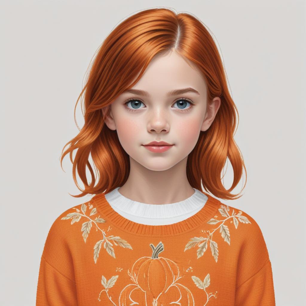A girl with vibrant red hair smiles softly wearing an orange sweater adorned with floral patterns, capturing a warm autumn vibe.
