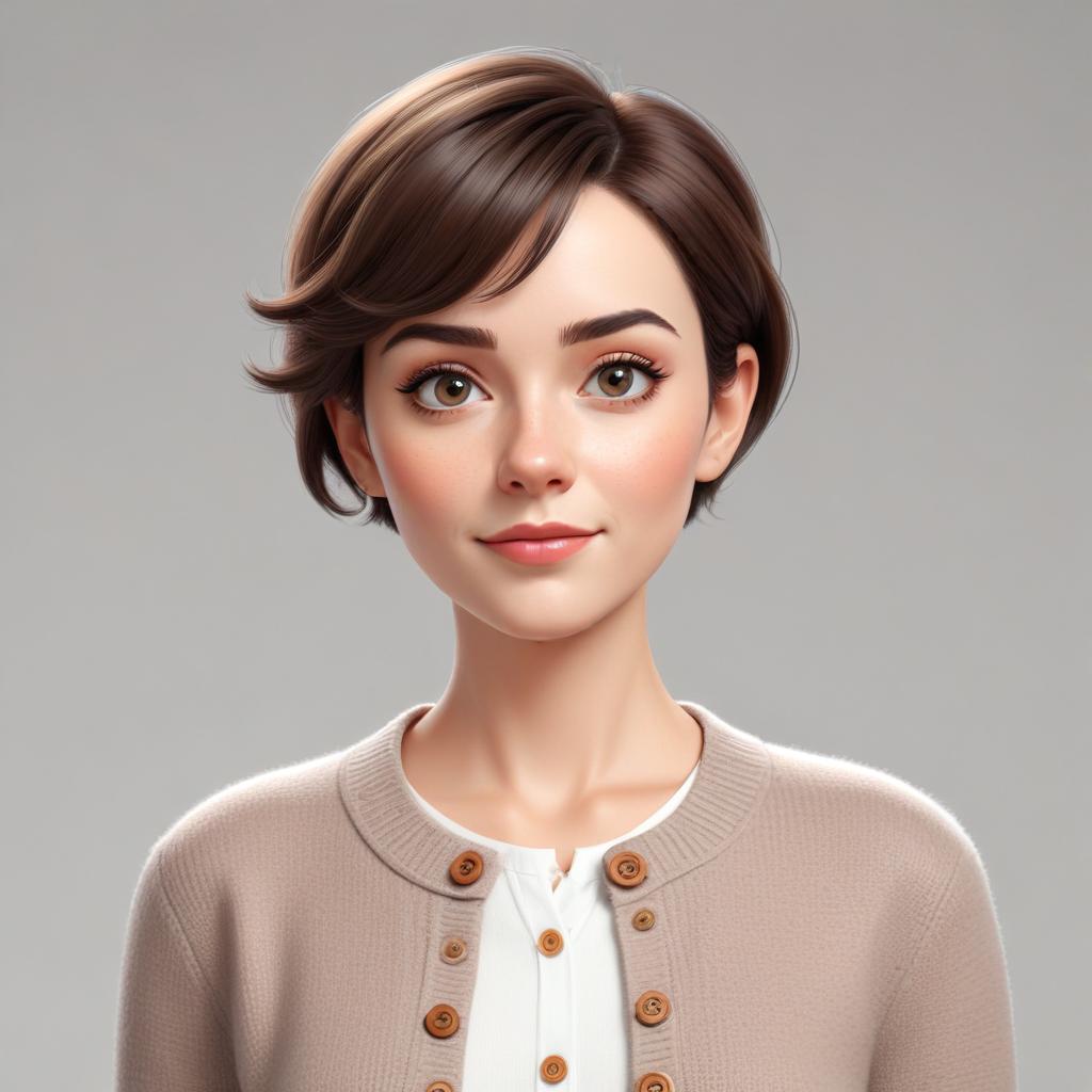 3D model, animation, brown hair, character design, clothing details, creative art, digital art, expressive face, facial features, female character, friendly appearance, graphic design, illustration, neutral background, portrait, realism, short hair, soft expression, virtual character, woman
