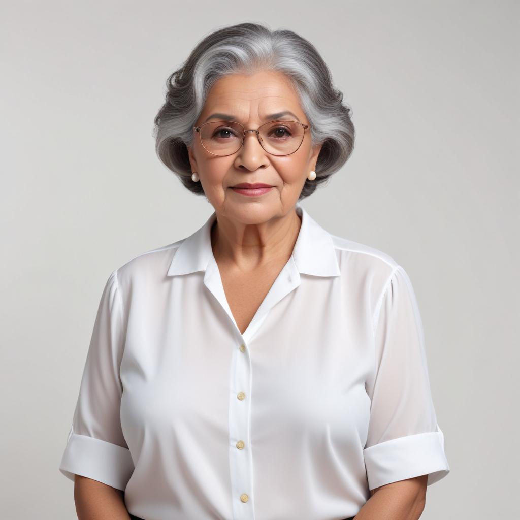 An elderly woman stands gracefully, wearing a white shirt and glasses. Her gray hair is styled neatly, showcasing her gentle demeanor.