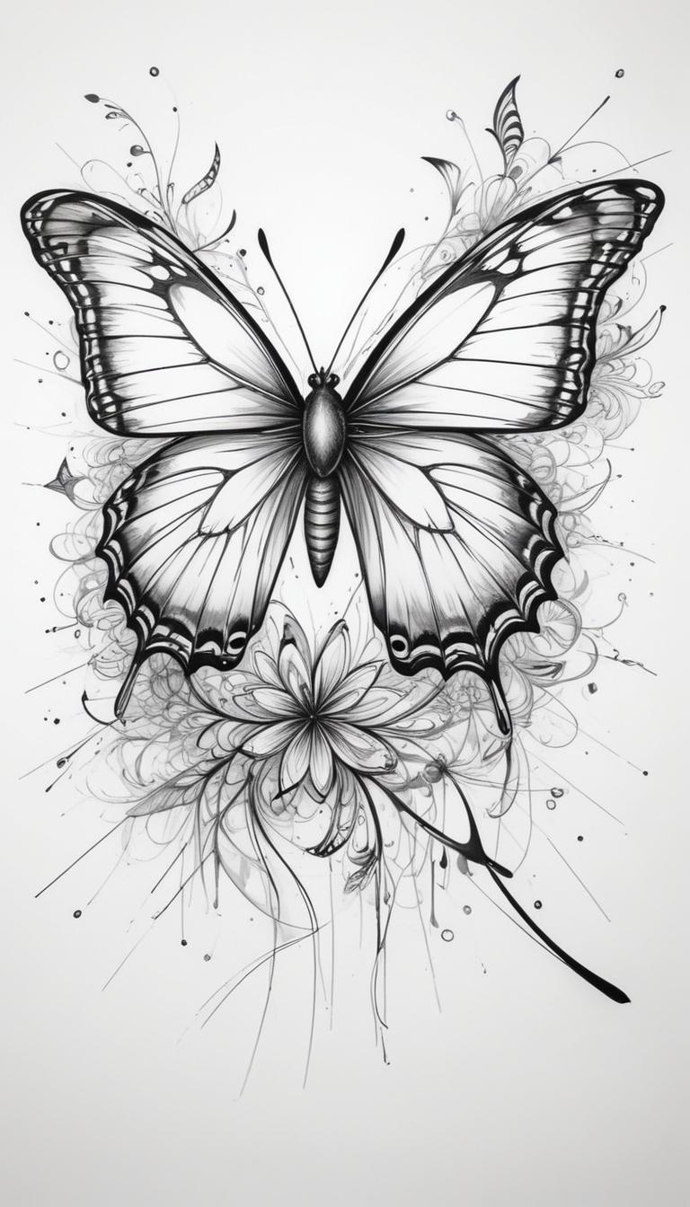 A detailed black and white drawing of a butterfly surrounded by delicate floral patterns. The artwork showcases fine lines and graceful forms.
