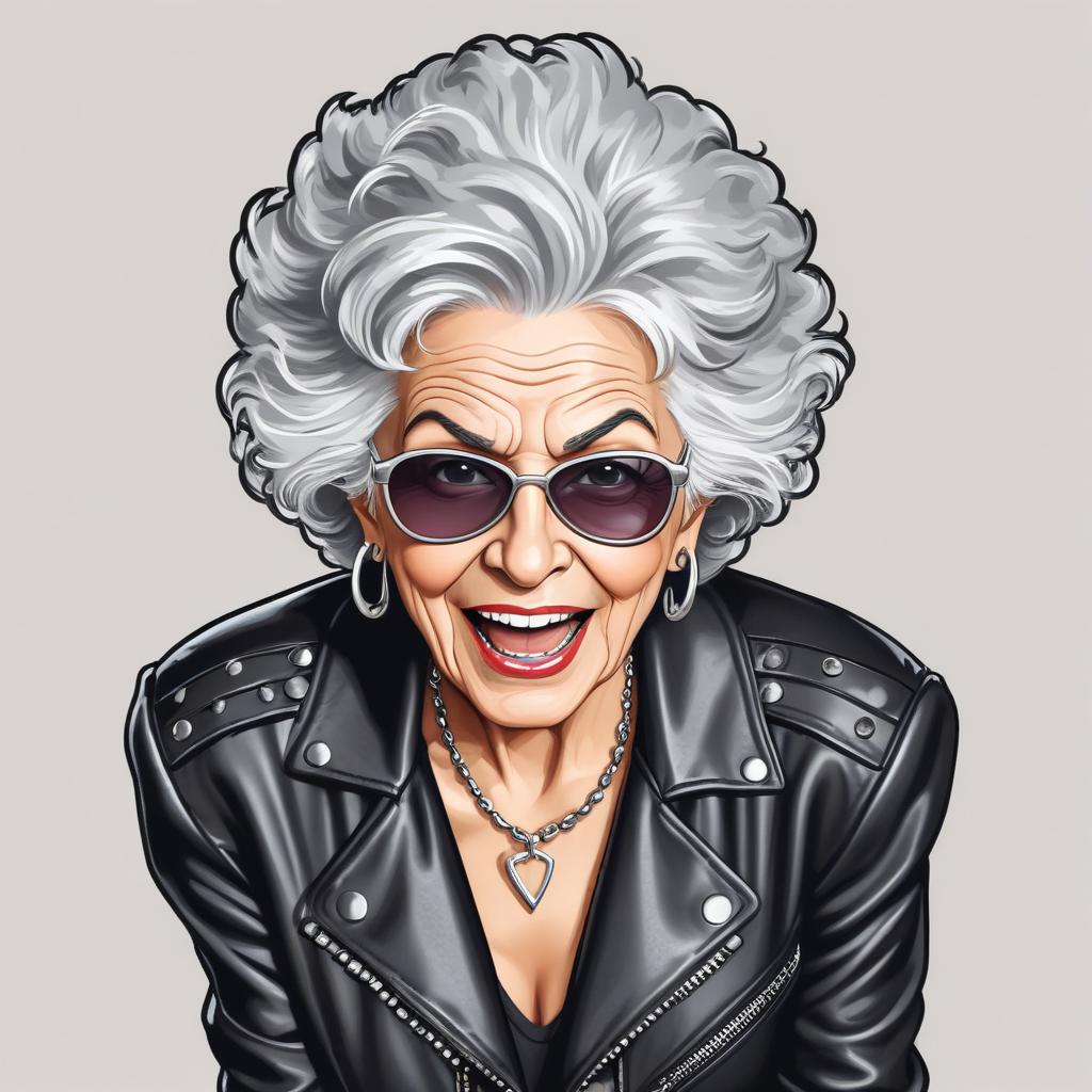 animated character, attitude, confident, curly hair, elderly, expression, fashion, fun, happy, joyful, leather jacket, lively, modern, personality, portrait, senior woman, silver hair, smiling, stylish, sunglasses