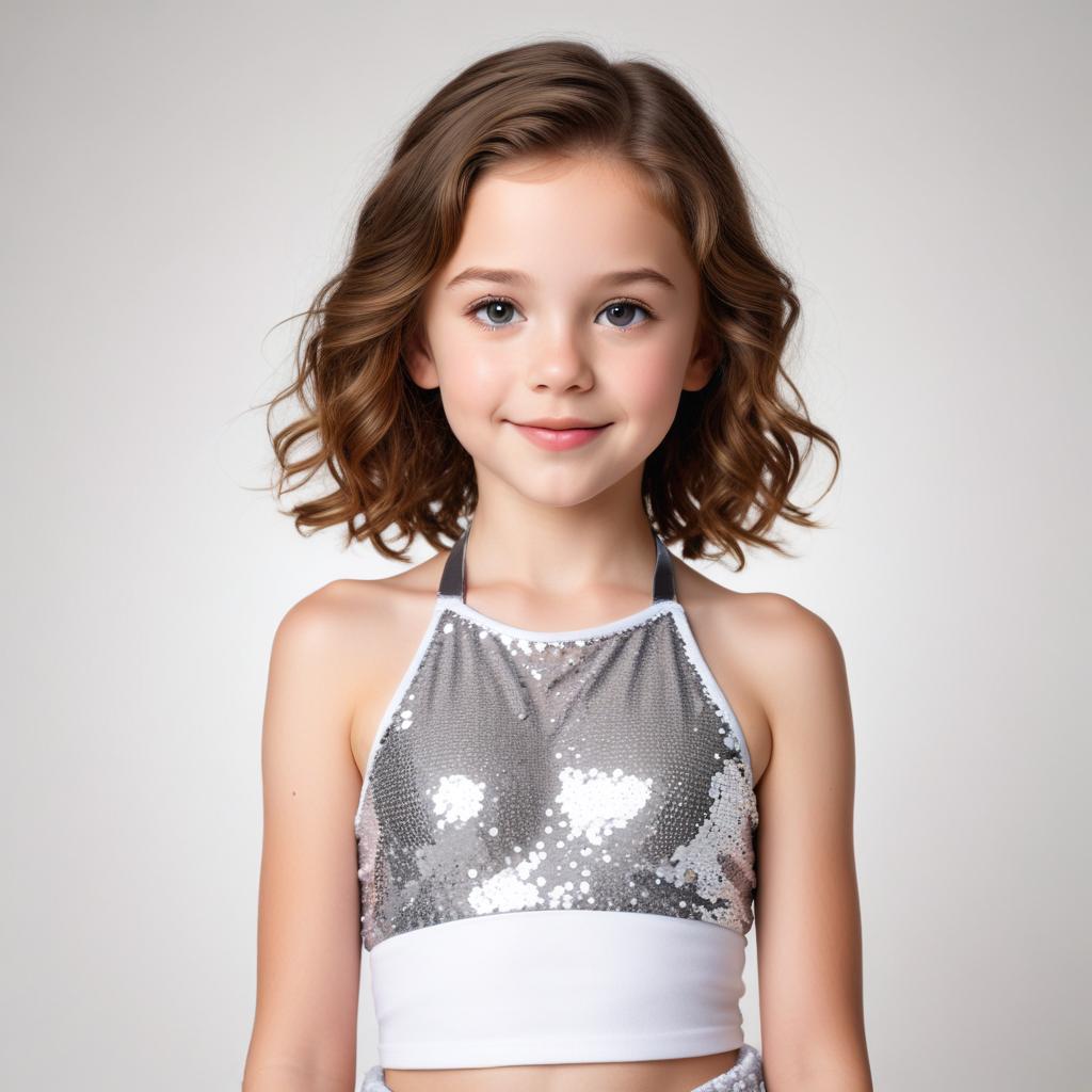 A young girl in a sparkly dance outfit smiles confidently.