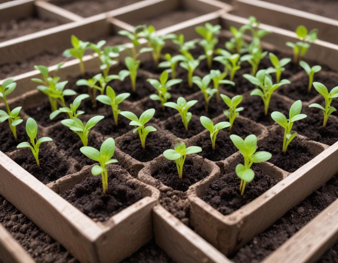 Tiny green seedlings sprout in neatly arranged trays filled with rich soil under bright light, ready for transplanting soon.
