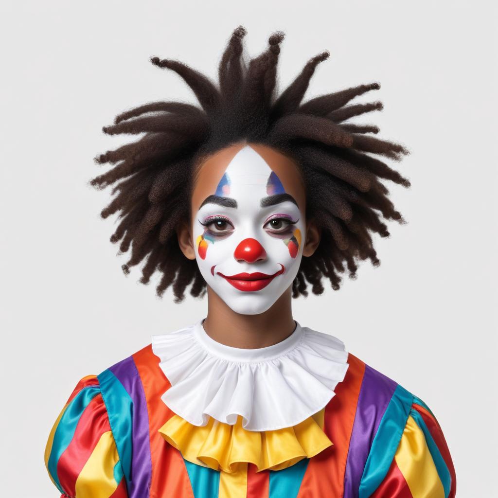 A cheerful clown with vibrant hair and face paint stands against a plain background, ready to entertain and spread joy at a festive event.