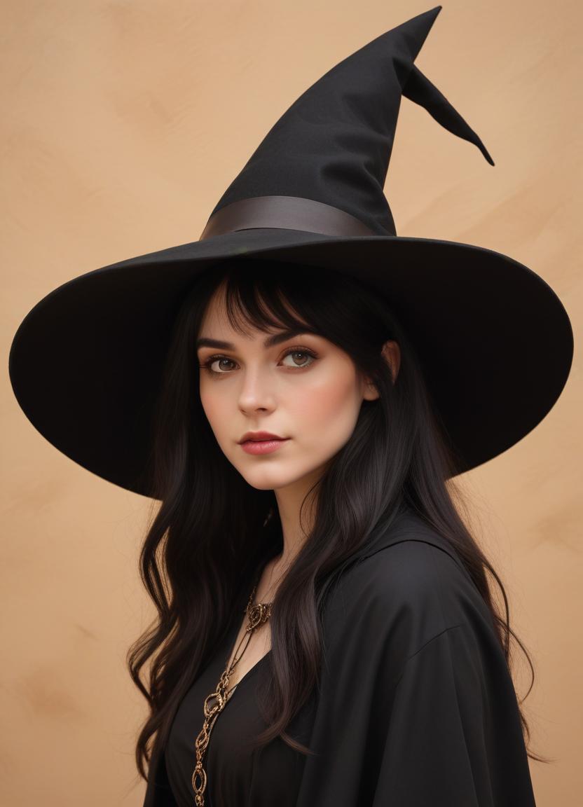 A witch styled model poses against a plain background, showcasing an elegant black hat and mystical outfit that elevate her enchanting look.