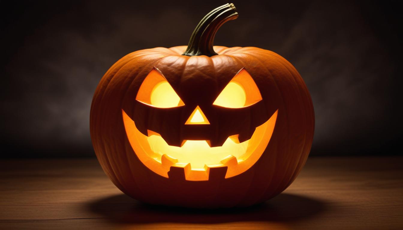 A carved pumpkin glows in the dark, showcasing a playful face. It symbolizes the excitement of Halloween festivities during the fall season.