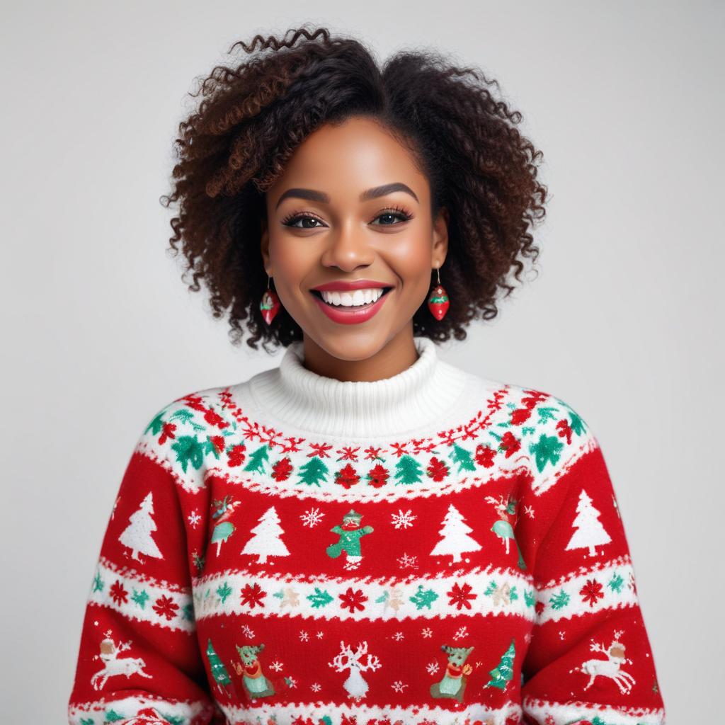 Woman smiles brightly while wearing a vibrant red holiday sweater. Colorful designs of trees and reindeer add festive cheer to the scene.