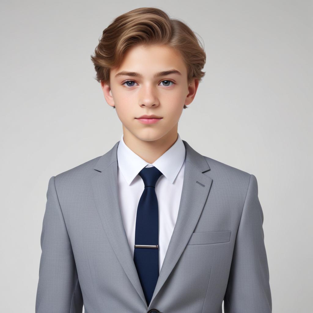blue eyes, boy, child, confidence, elegant, fashion, formal wear, gray suit, hairstyle, male, model, neutral background, portrait, professional, serious expression, smart attire, style, suit, tie, young