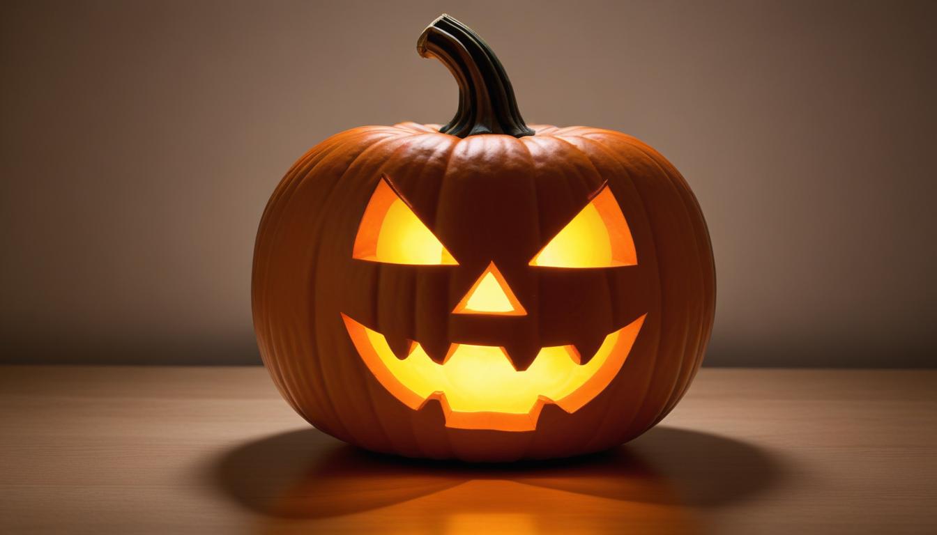 A carved pumpkin glows with an eerie light, showcasing a spooky face. It is placed on a table, perfect for the Halloween season.
